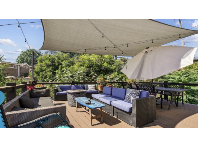 Relax on the spacious deck with lounge chairs, hammocks, and a hot tub surrounded by greenery.
